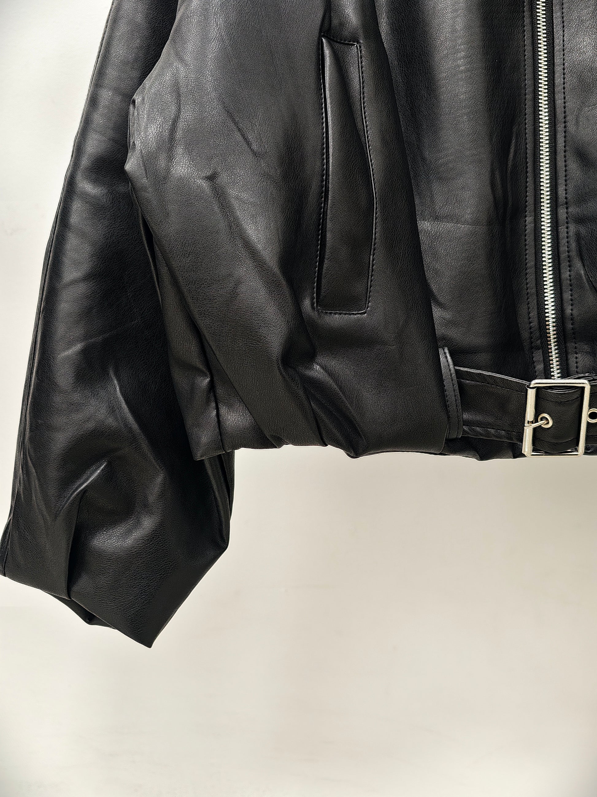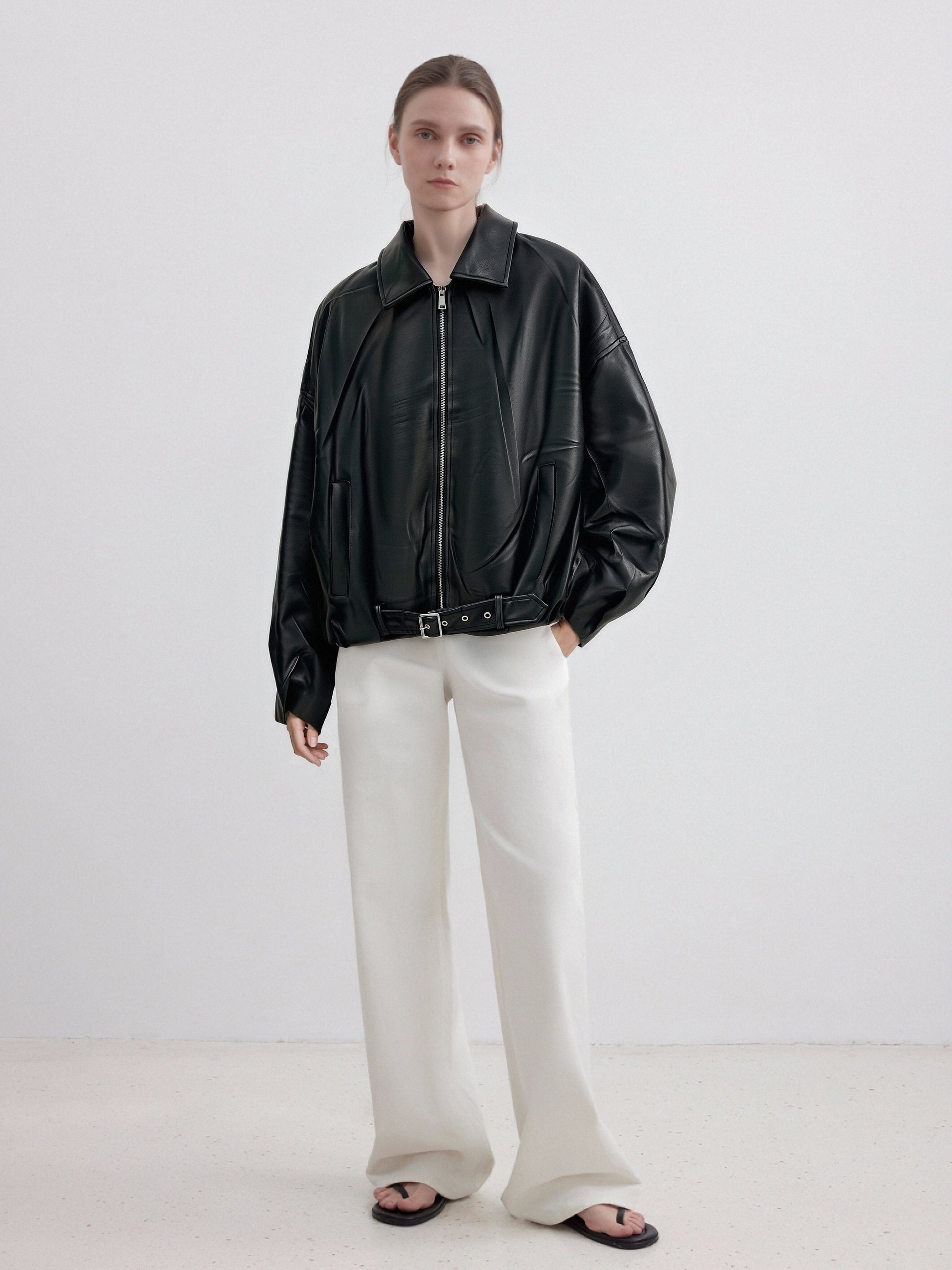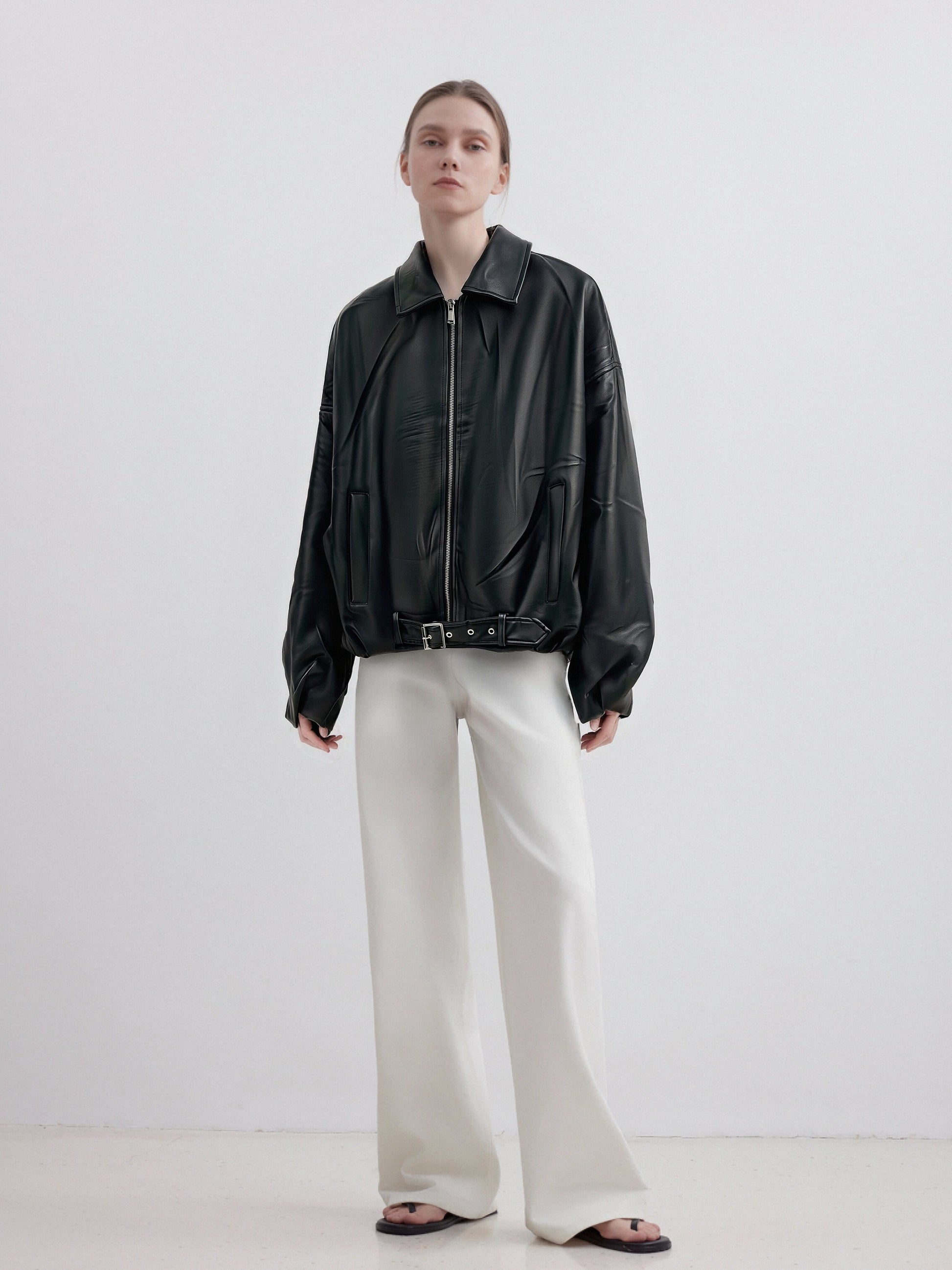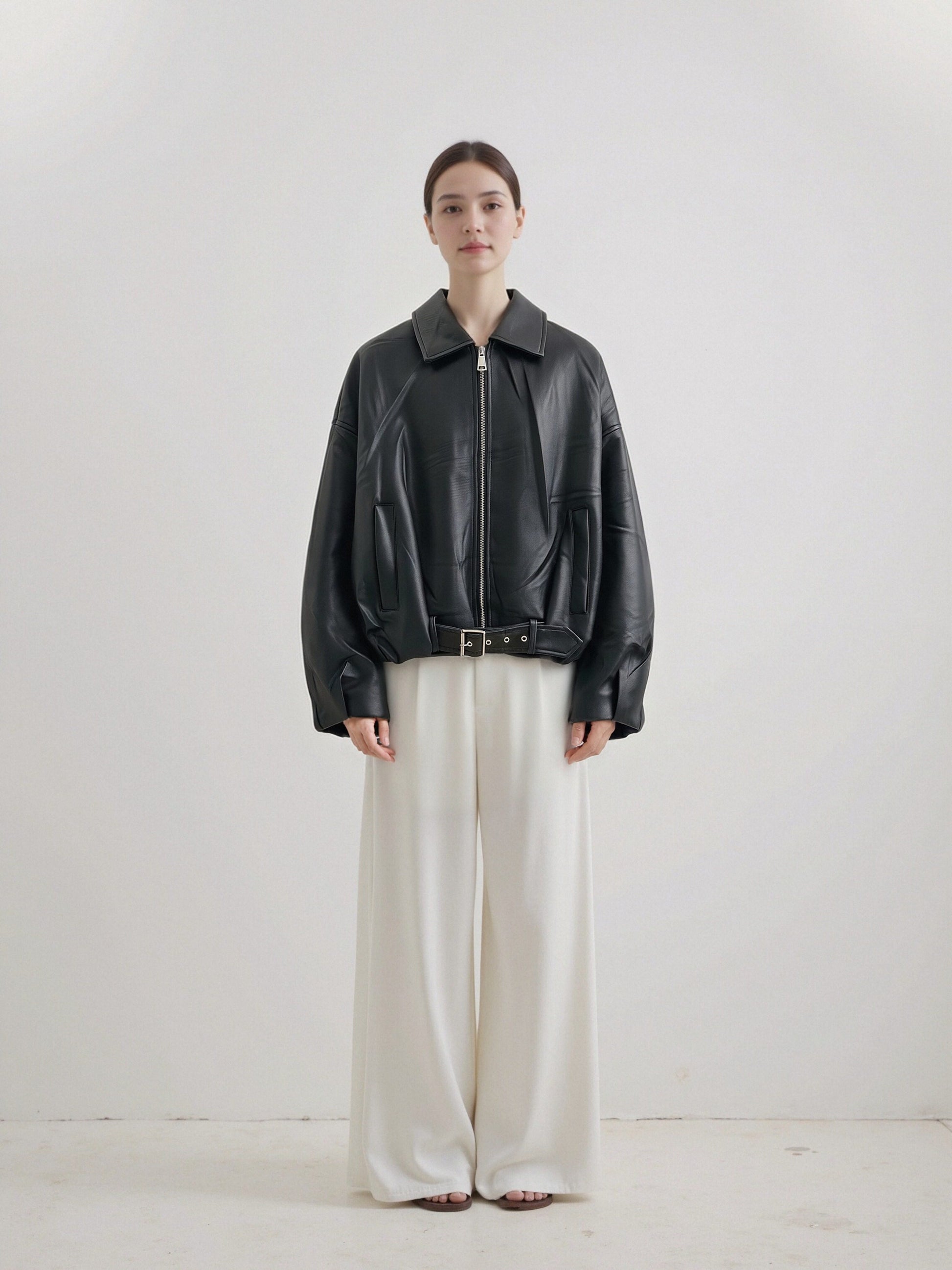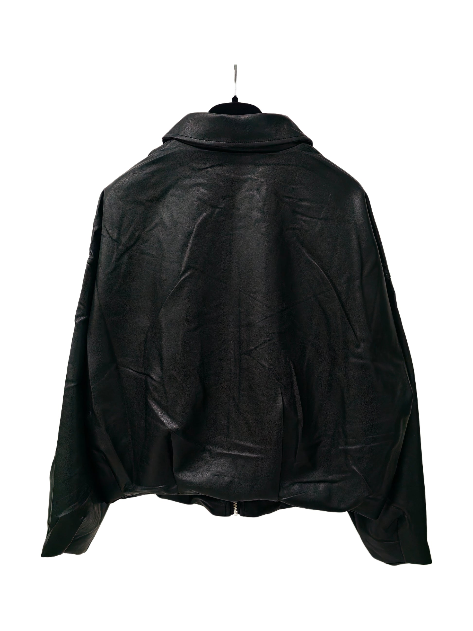 This oversized faux leather bomber jacket features a smooth, structured finish with a modern, effortless edge. Designed with a classic pointed collar, front zip closure, and subtle pocket detailing, it delivers a clean silhouette balanced by bold proportions.