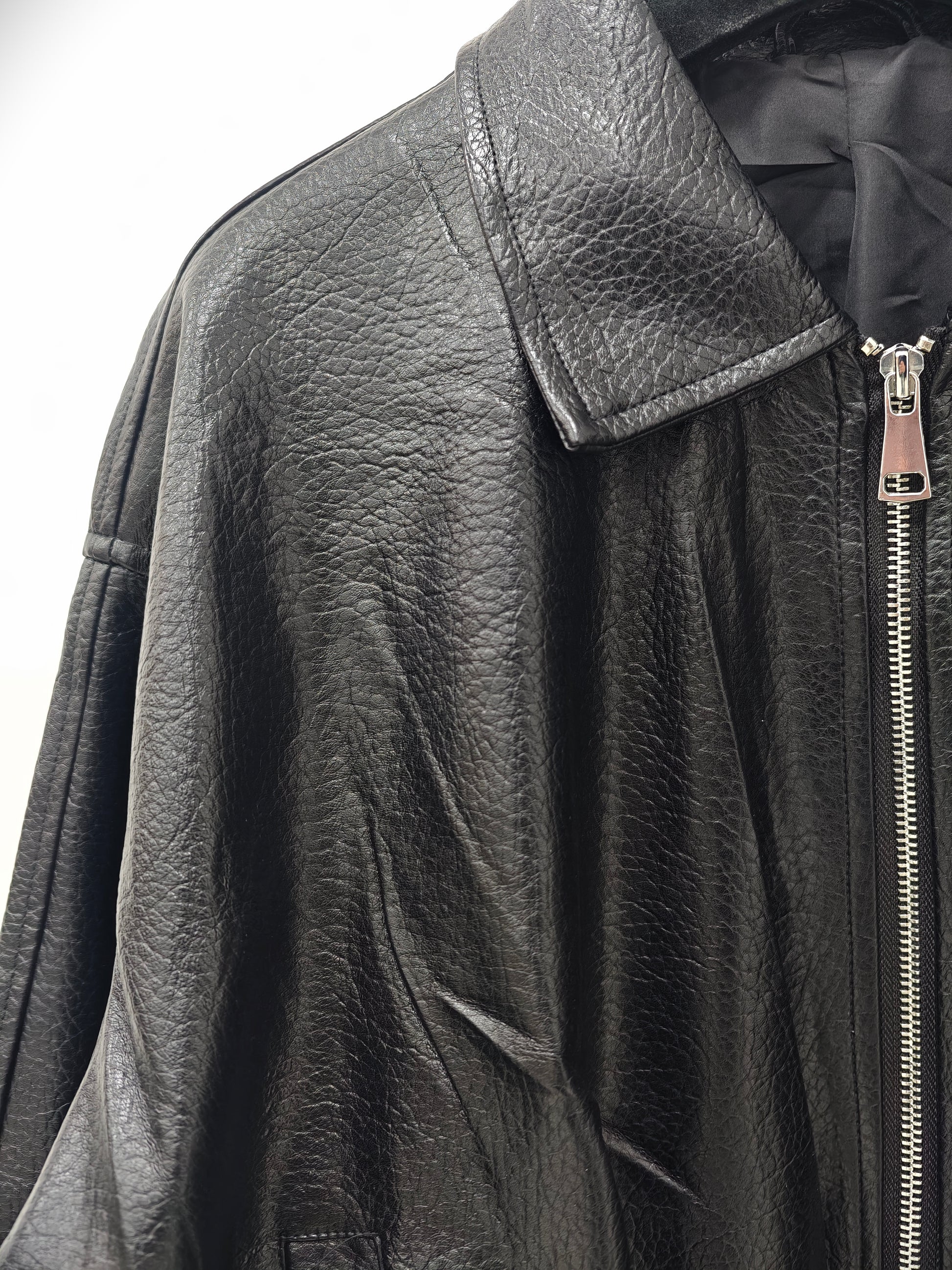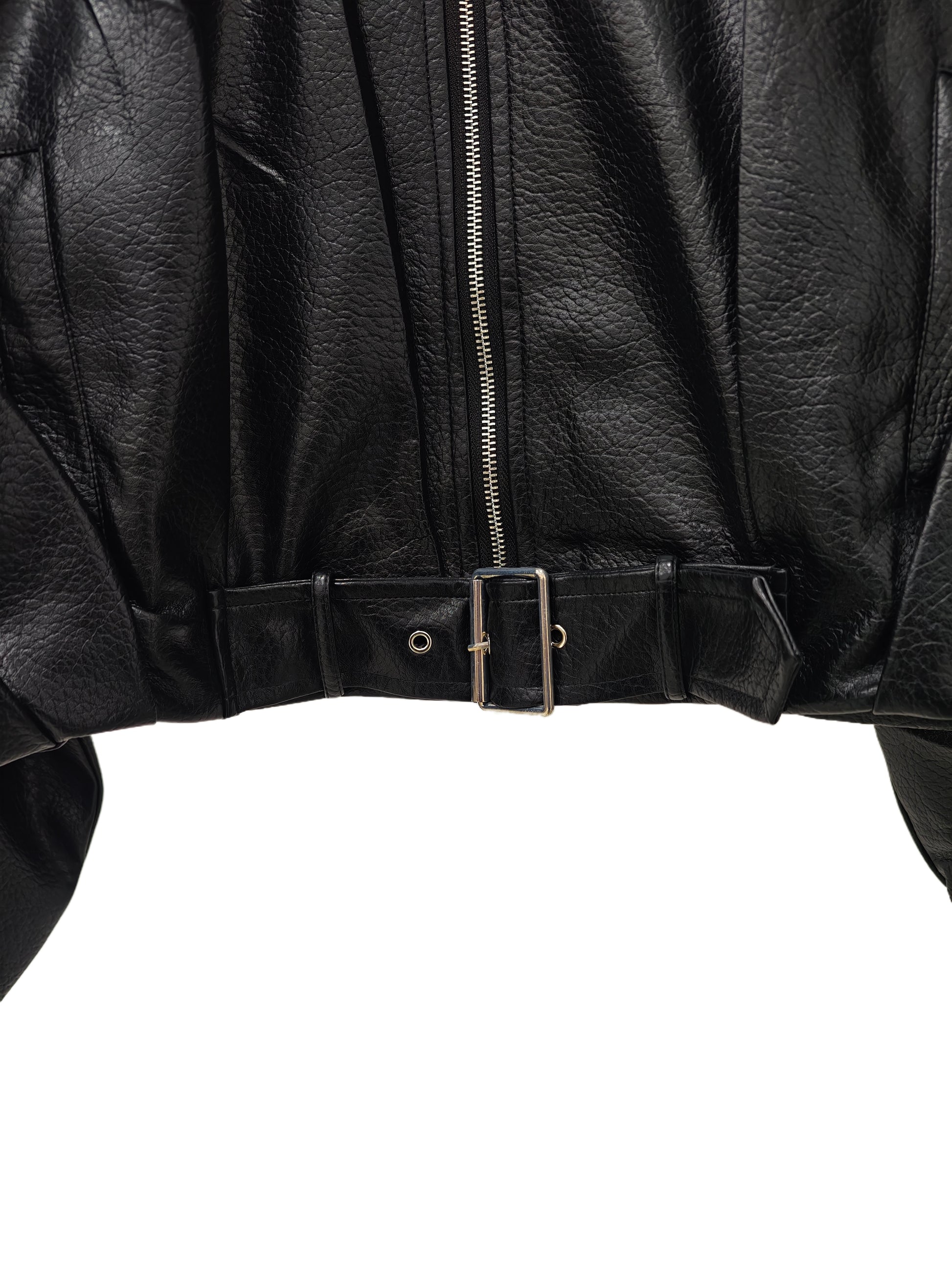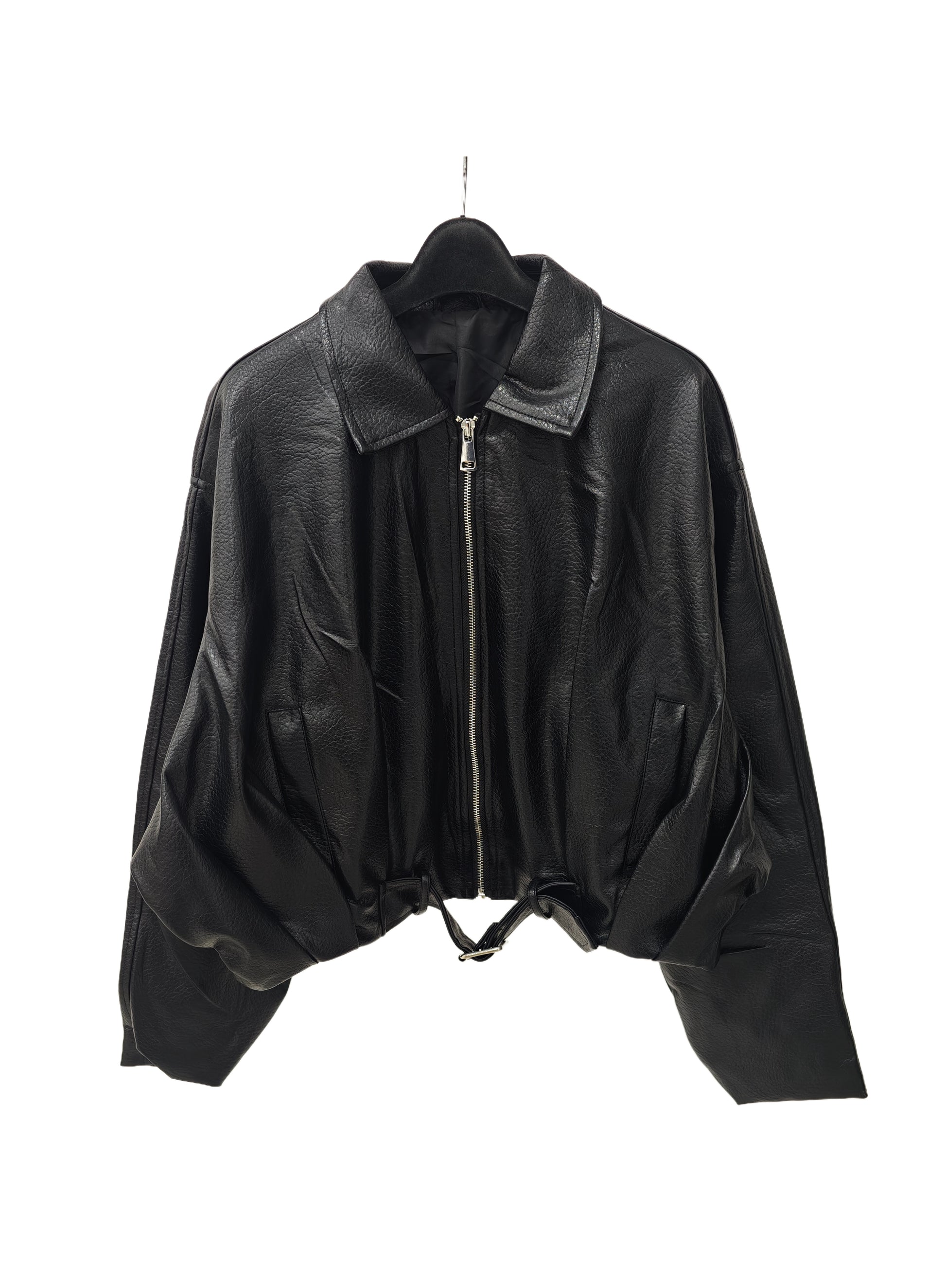 A sleek black faux leather jacket designed with a relaxed oversized fit and a clean cropped silhouette. Soft, textured, and lightweight, it layers effortlessly over everyday outfits. The zip-up front and adjustable hem add subtle structure, making it perfect for minimalist street style and modern city wear.