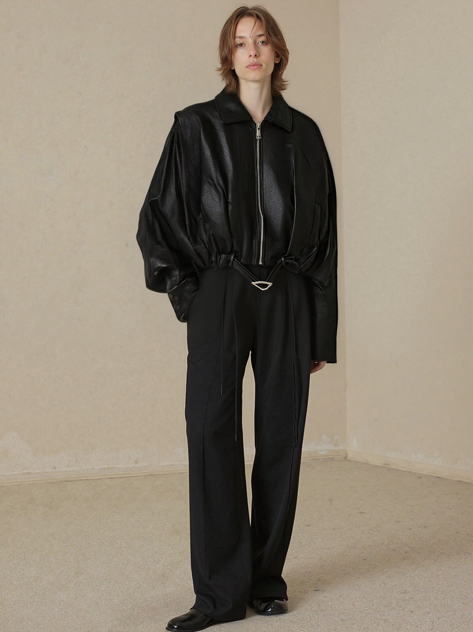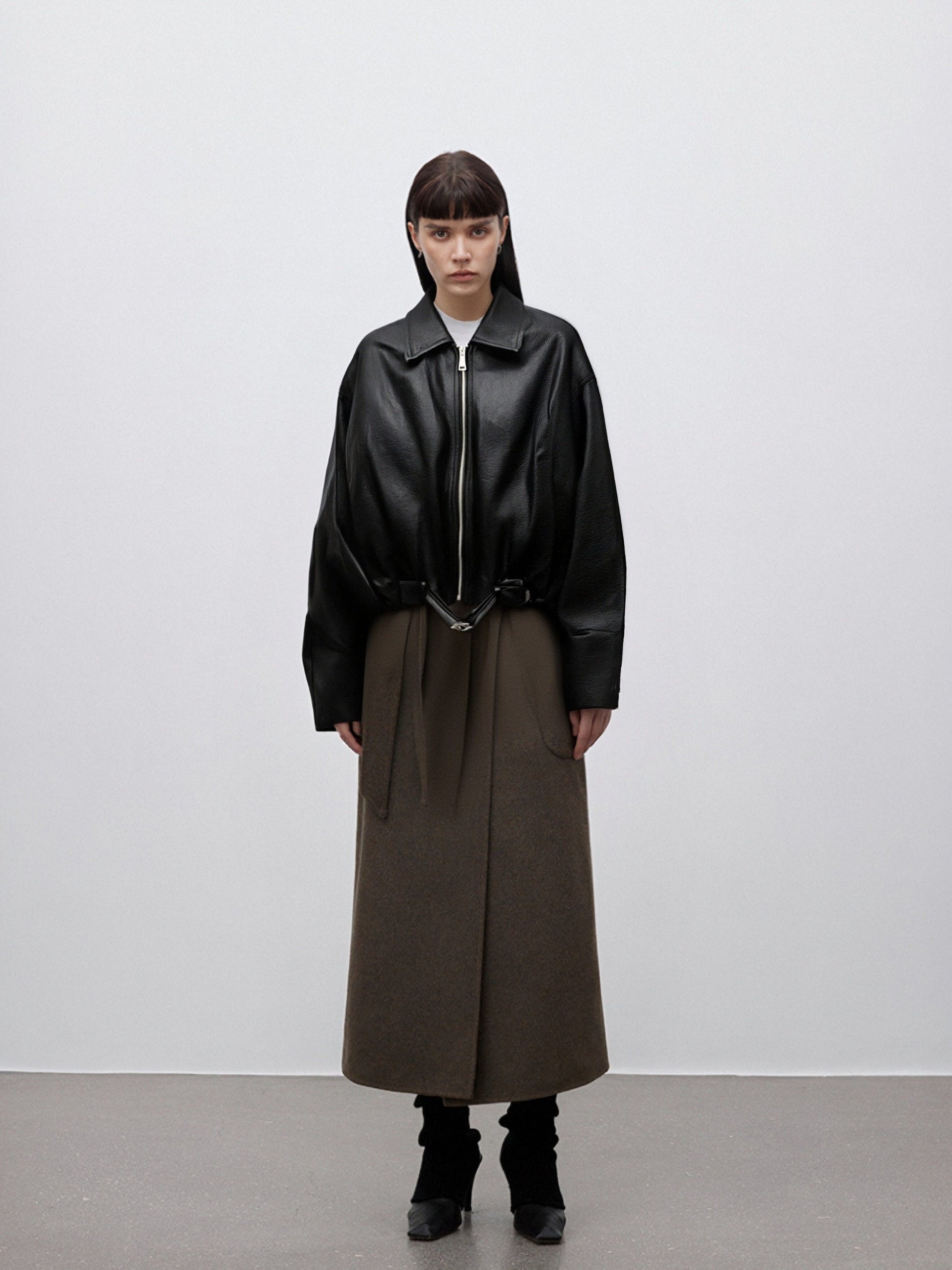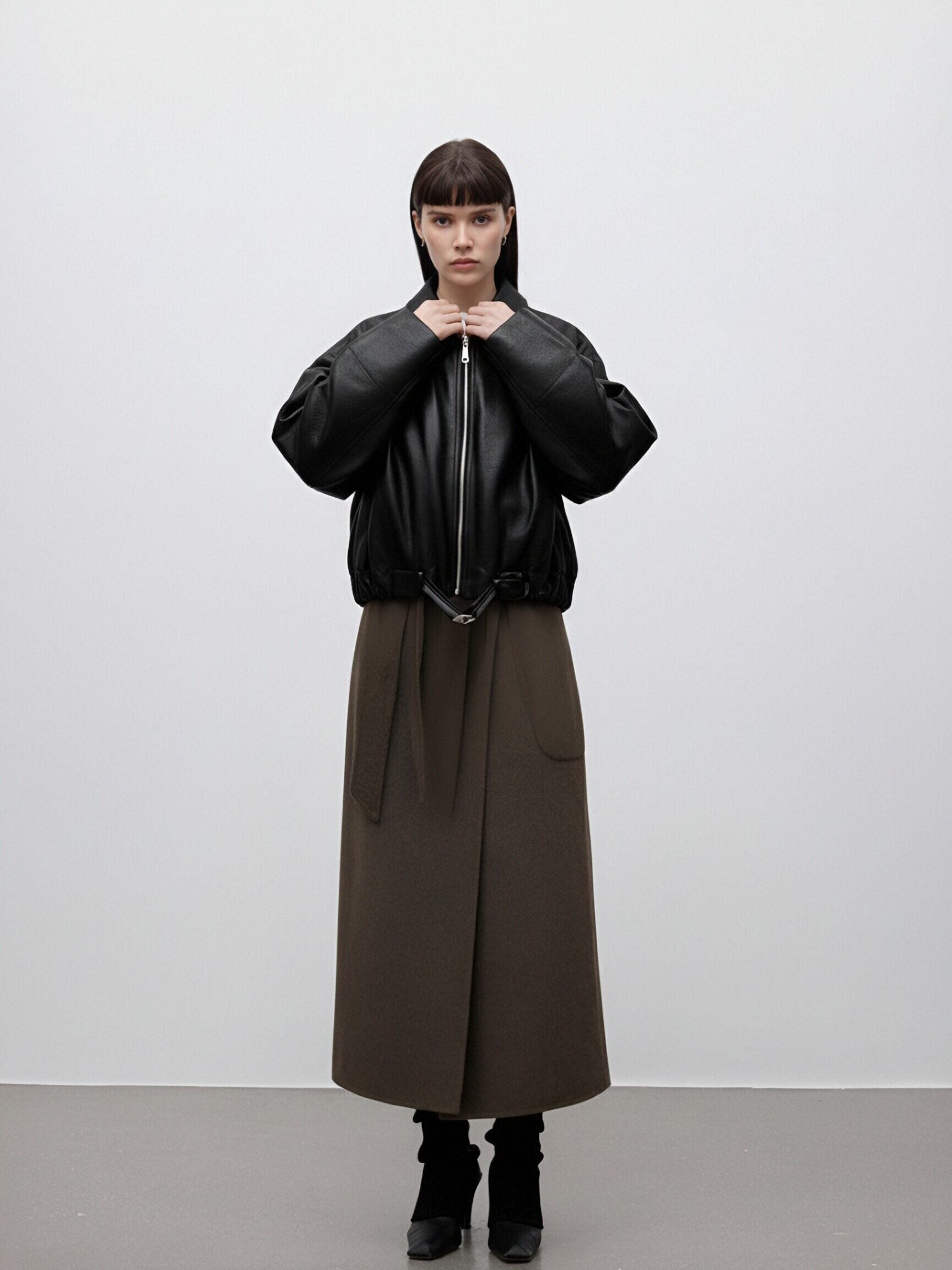 A sleek black faux leather jacket designed with a relaxed oversized fit and a clean cropped silhouette. Soft, textured, and lightweight, it layers effortlessly over everyday outfits. The zip-up front and adjustable hem add subtle structure, making it perfect for minimalist street style and modern city wear.