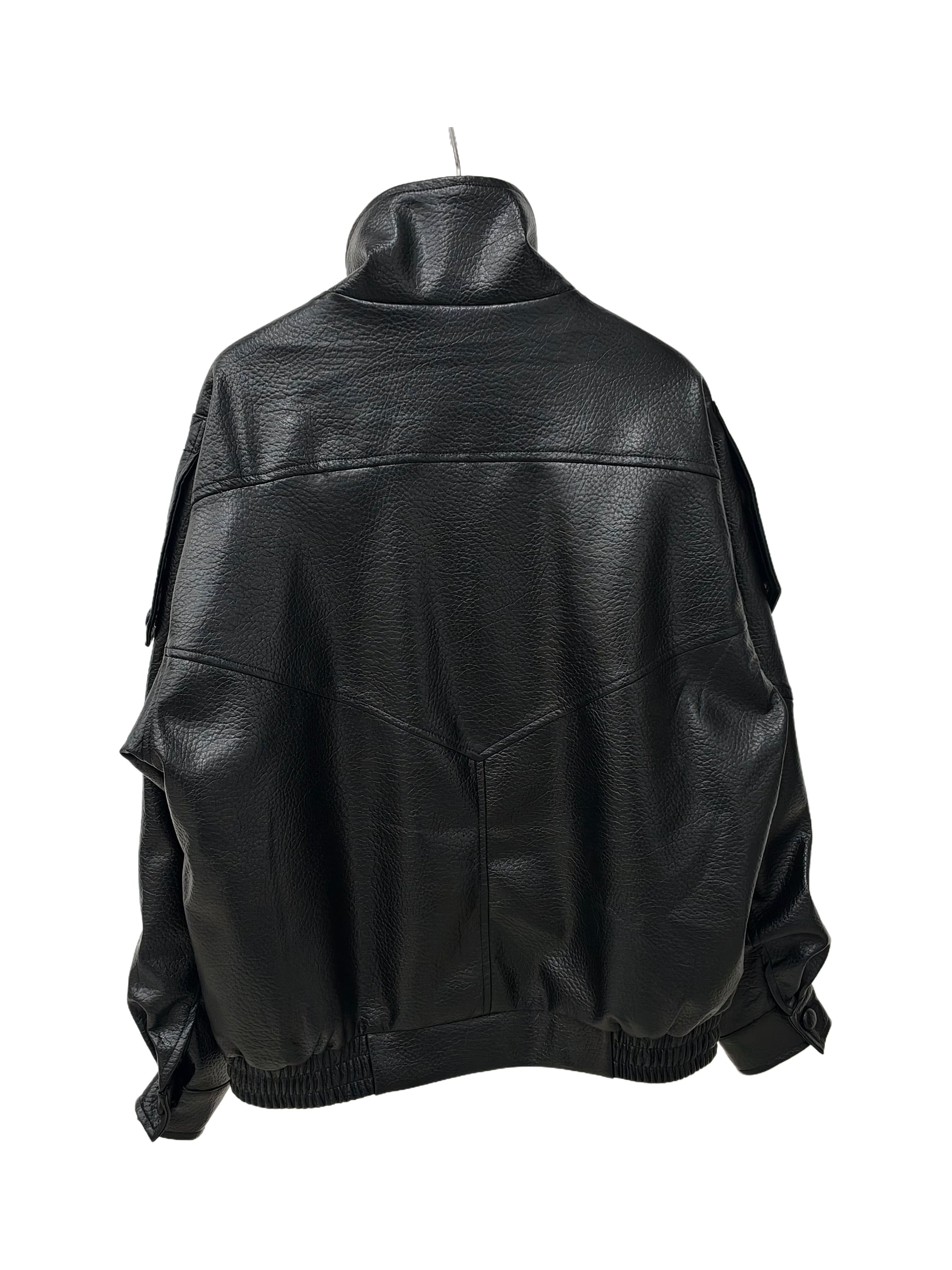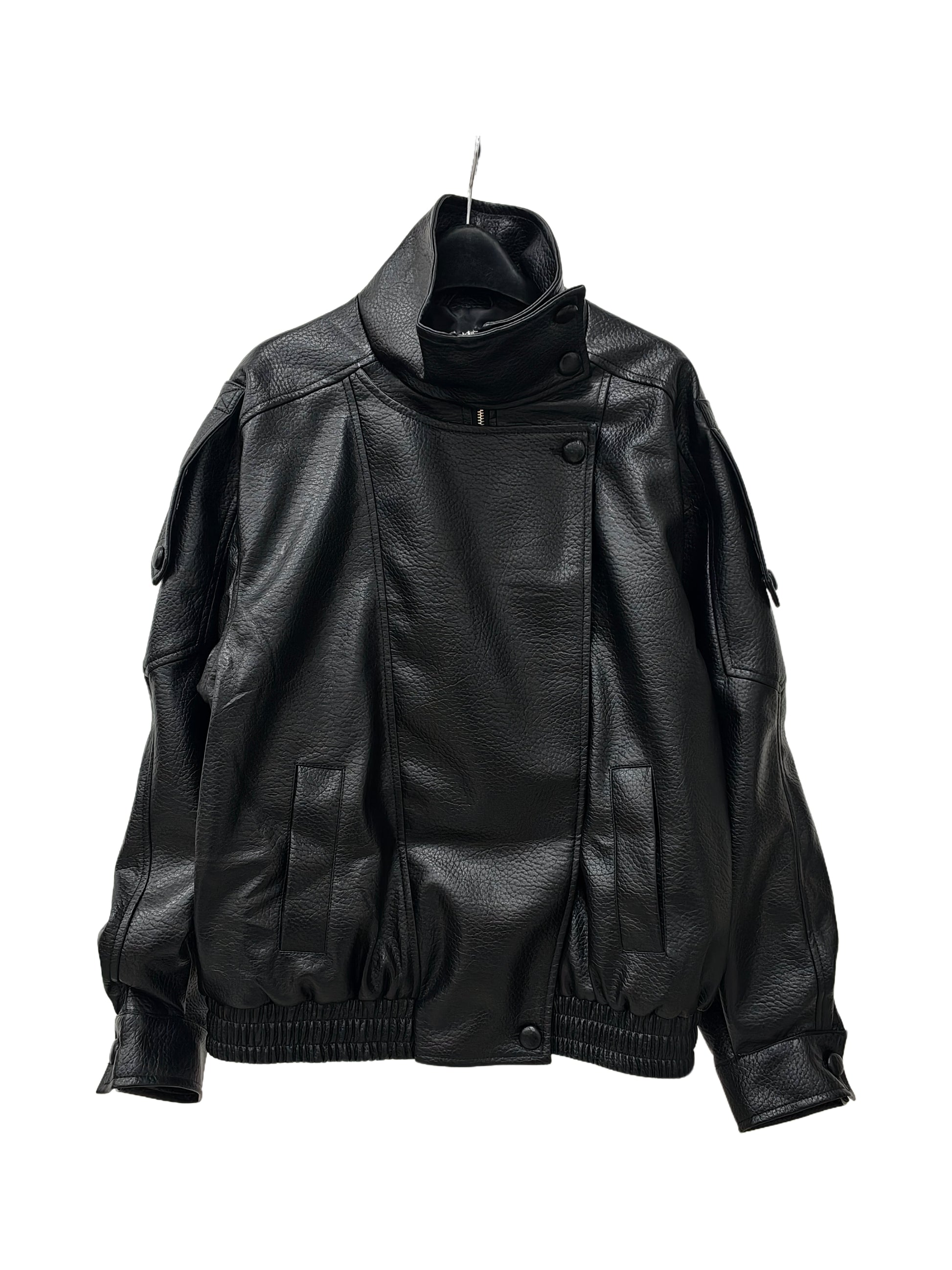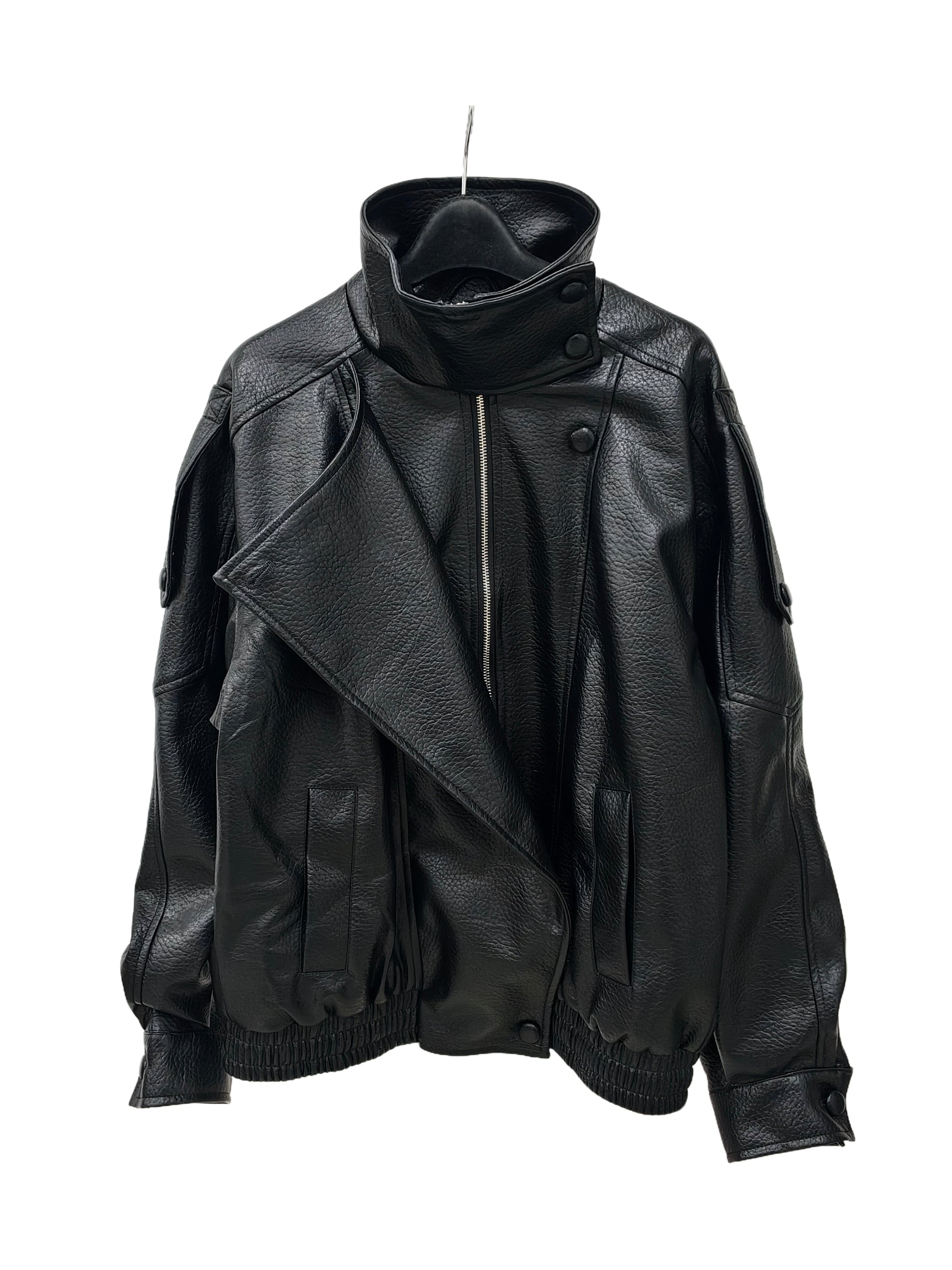 A statement black faux leather jacket designed with an oversized silhouette and a structured high-neck collar. Softly textured and warm, it offers both comfort and edge for fall and winter styling. The asymmetrical panel detail and zip-up front create a modern moto-inspired look, perfect for elevated street style and everyday wear.