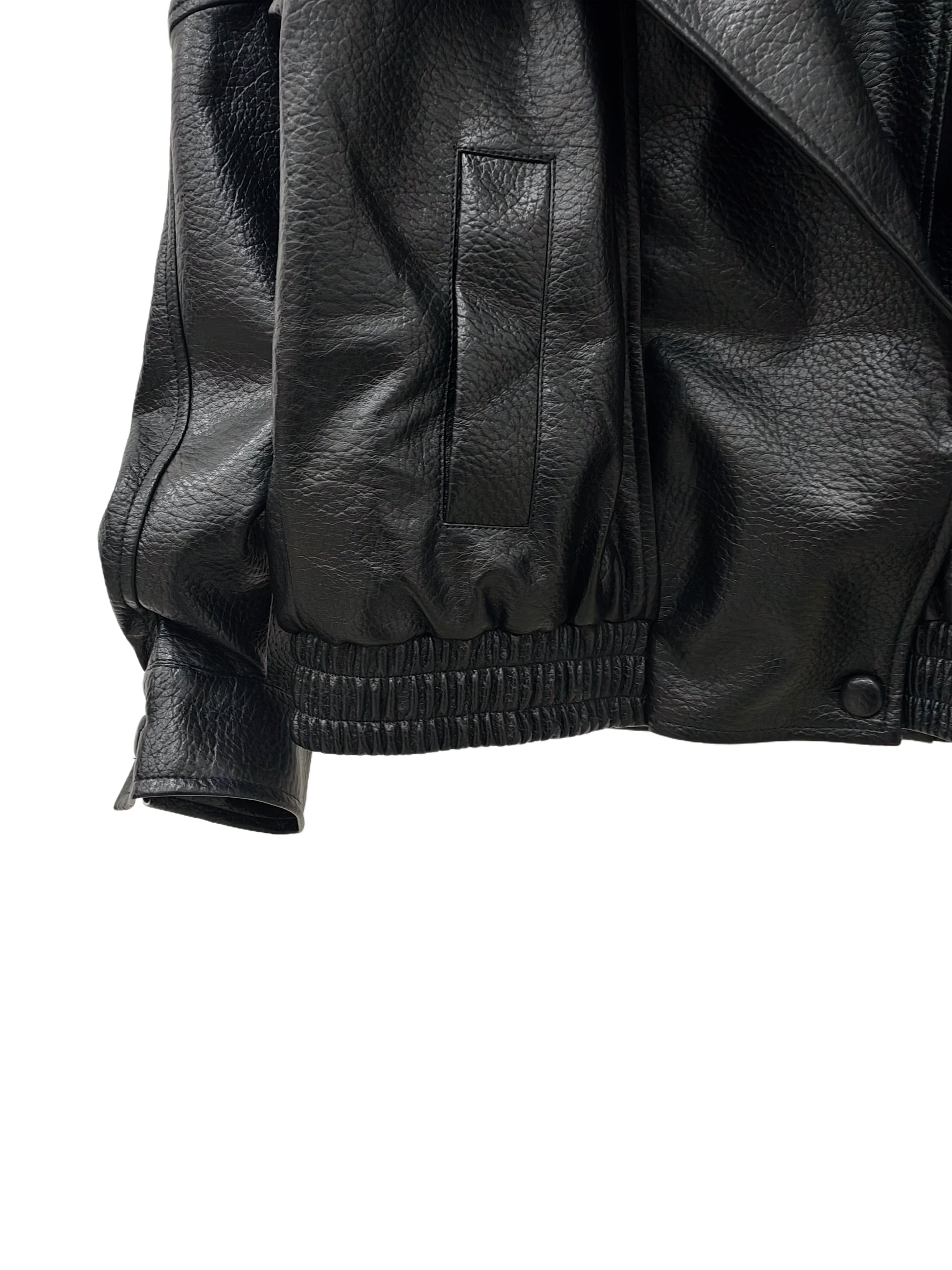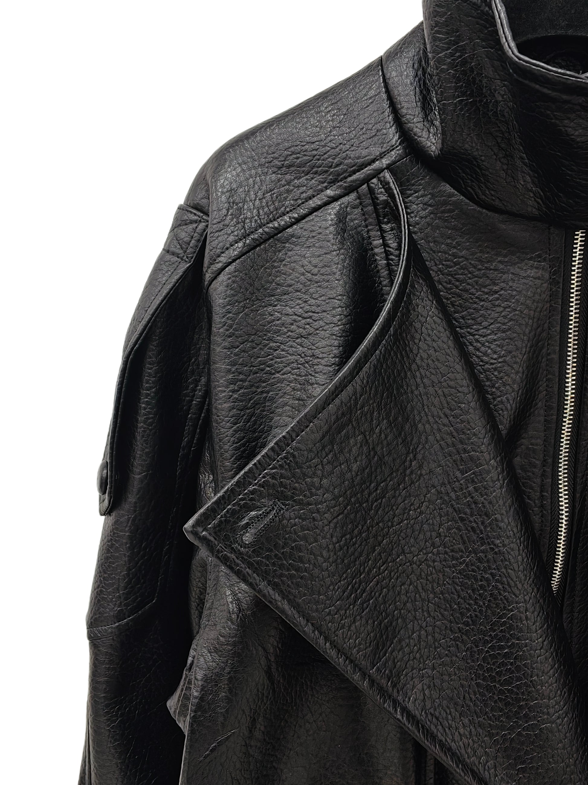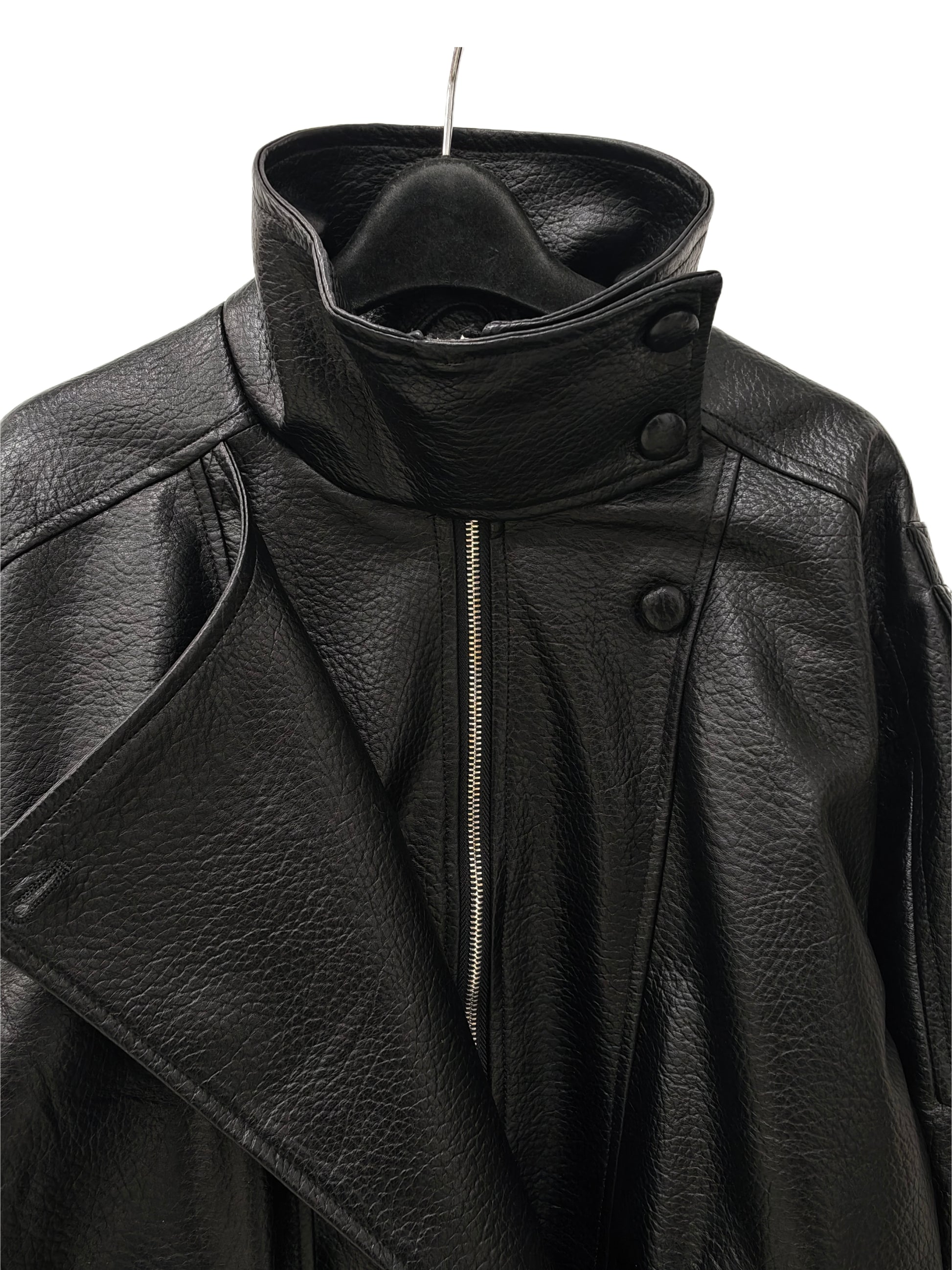 A statement black faux leather jacket designed with an oversized silhouette and a structured high-neck collar. Softly textured and warm, it offers both comfort and edge for fall and winter styling. The asymmetrical panel detail and zip-up front create a modern moto-inspired look, perfect for elevated street style and everyday wear.