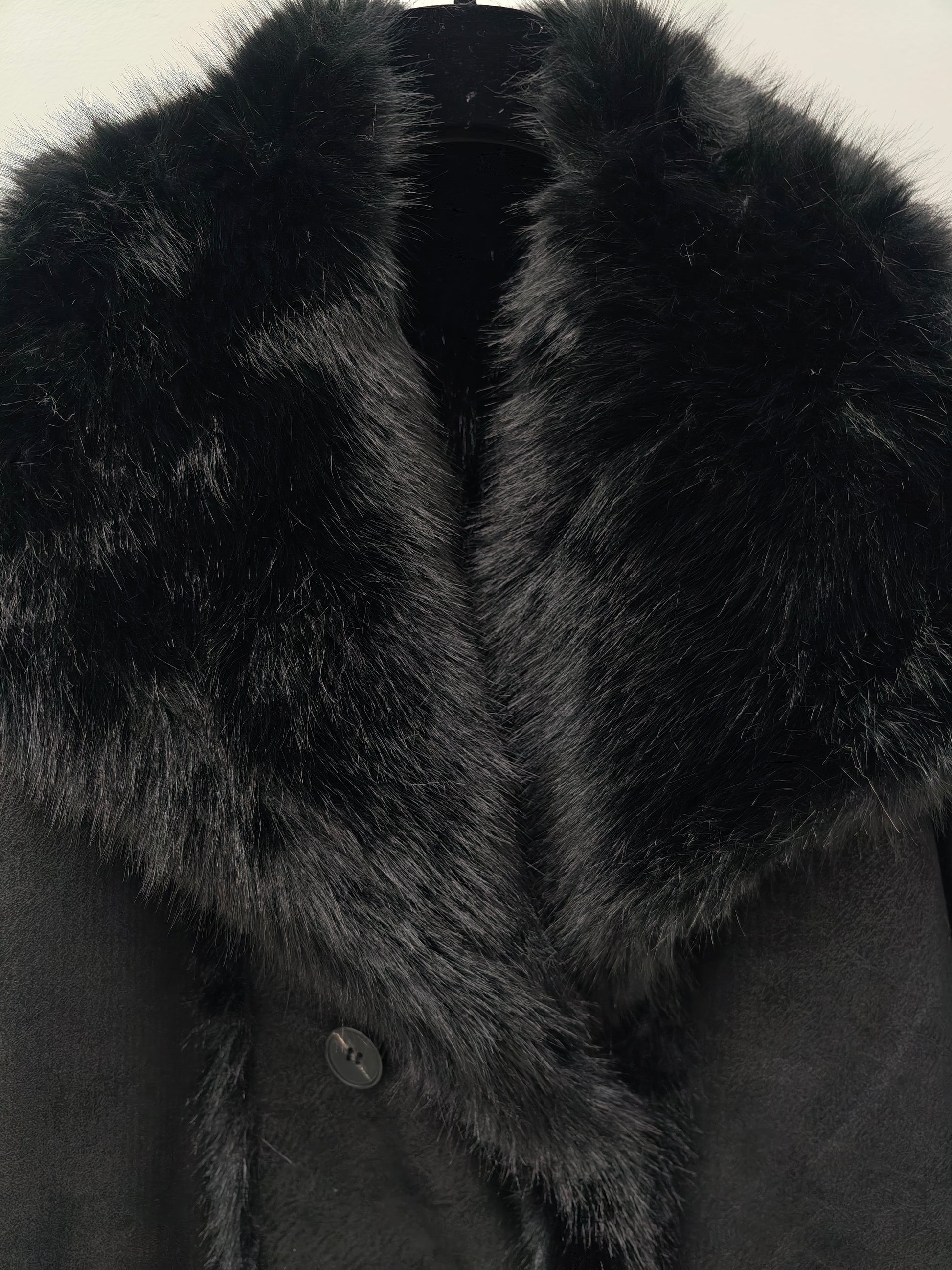 A luxurious reversible winter coat with soft faux fur on one side and smooth shearling on the other. Switch styles anytime—modern, sleek, and incredibly warm. The oversized fur collar and full-length design keep you cozy in cold weather. Perfect for daily winter outfits, street style, and chic night looks.